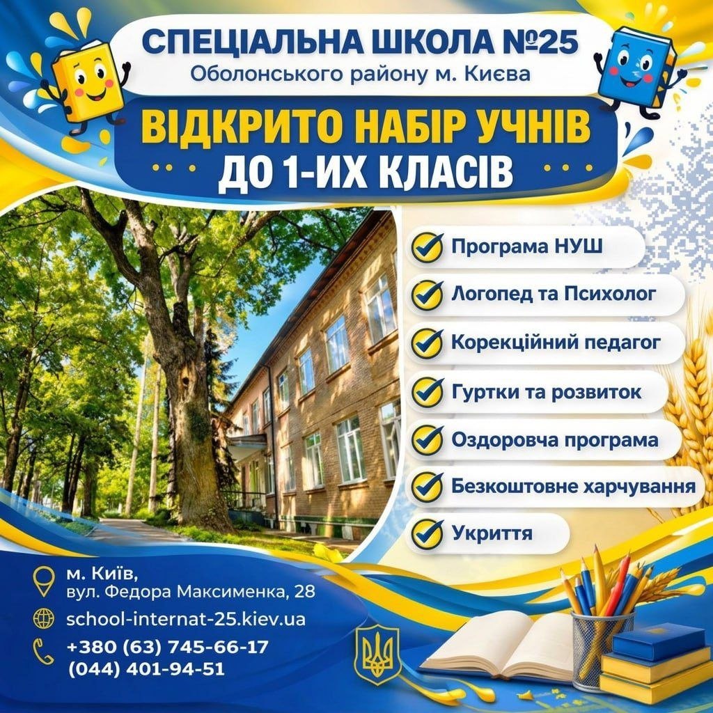 Спеціальна школа №25 Оболонського району м. Києва забезпечує здобуття загальної середньої освіти на рівні початкової освіти для осіб з особливими освітніми потребами.